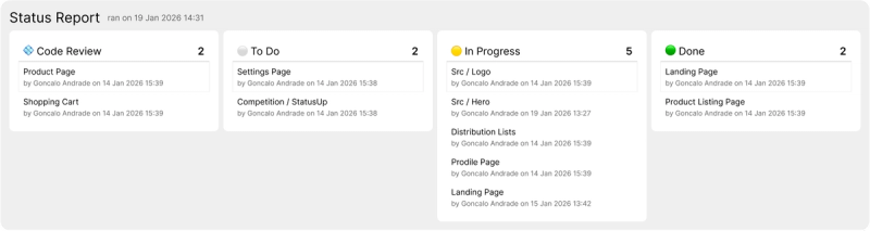 - In order to not rely on humans remembering to update the report, each time a status is updated, the report is updated too.