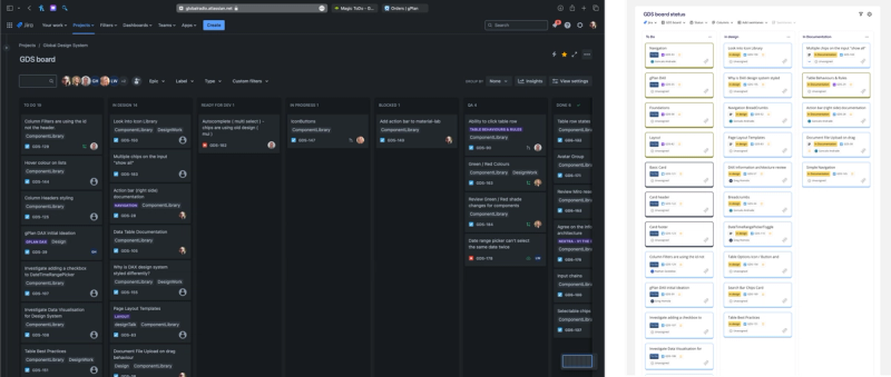 Because Jira isn’t a designer’s natural habitat, we sync those tickets to the Miro board where we have our weekly Design Talks, so we don’t need to move between apps, and we can organise our workload there.Jira Board where work is tracked for allMiro synced with Jira showing only tickets relevant for Design Talks so we don’t need to move between apps, and we can organise our workload there.